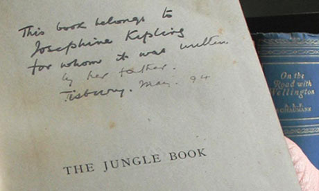 «This book belongs to Josephine Kipling for whom it was written by her father, May 1894.» Dedicatória de Rudyard Kipling para a sua filha mais nova escrita na primeira edição do livro The Jungle Book, descoberto agora em Cambridgeshire.