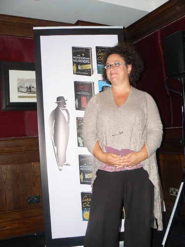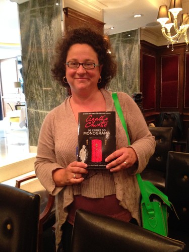 A autora ao lado de Mathew Prichard, neto de Agatha Christie. Há cerca de dois anos, a família de Agatha Christie escolheu Sophie Hannah para recriar um policial à Agatha Christie: «Esta é uma declaração de amor a Agatha Christie e a Poirot», diz Sophie Hannah que descobriu a "Rainha do Crime" aos 11 anos e aos 14 já tinha lido toda a sua obra.