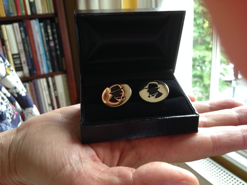 A silhueta de Poirot embutida em botões de punho.